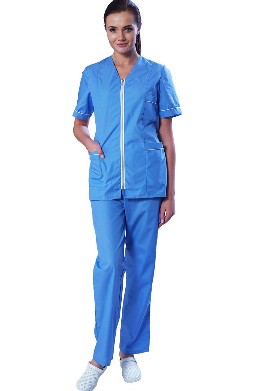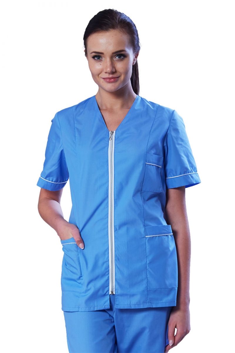 ➠ Блузка с V-образной горловиной, с центральной бортовой застежкой на молнию. Полочки с рельефами от линии плеча, с одним нагрудным и двумя нижними накладными карманами. Верхние срезы карманов обработаны обтачками. Спинка с хлястиком. Рукава втачные одношовные, короткие, с отделочными манжетами. В швы настрачивания обтачек и отделочных манжет вставлен декоративный кант.