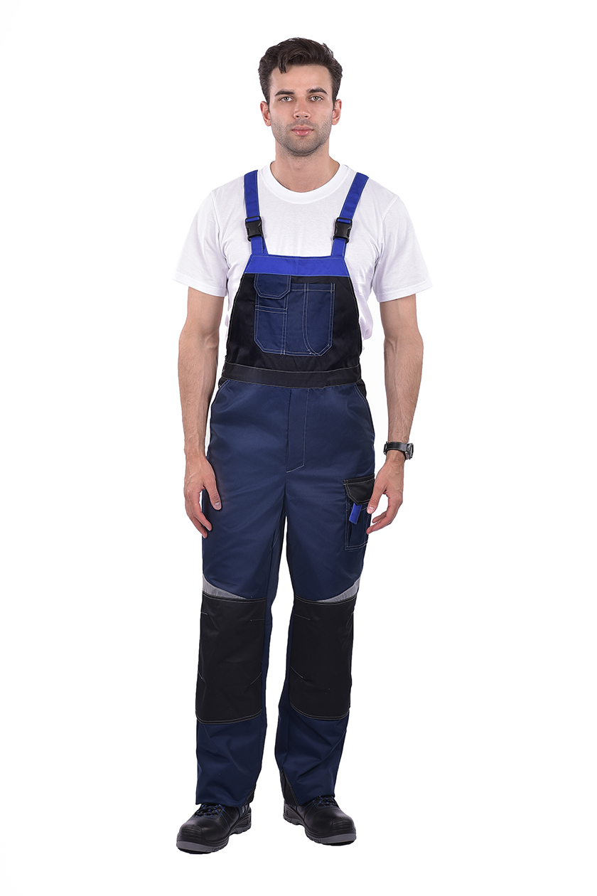 ➠ Полукомбинезон: застежка в правом боковом шве на пуговицу, в среднем шве — на «молнию». Карман с клапаном на грудке, боковые карманы с отрезным бочком. Один карман над левым наколенником. Колени усилены накладками, заложены по 2 вытачки.