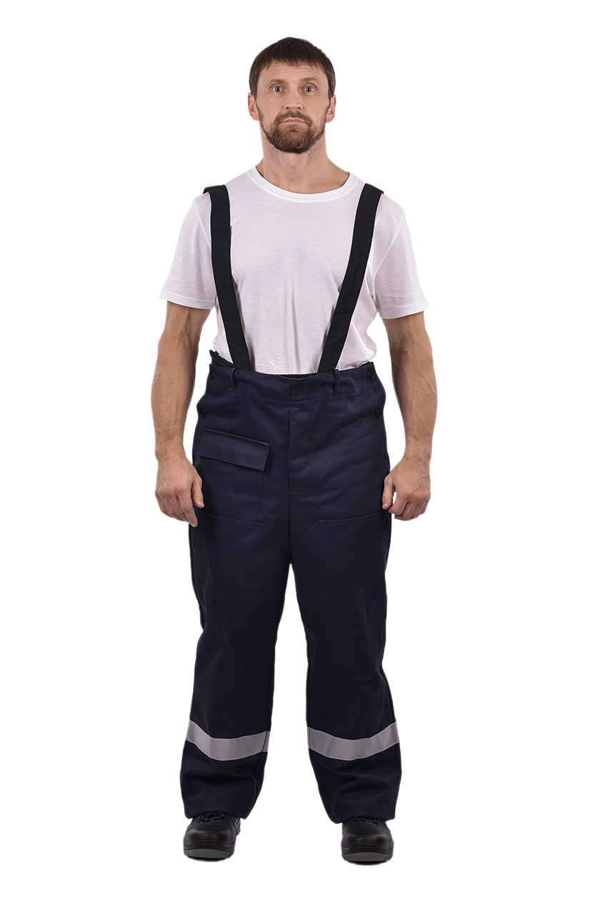 Передние половинки брюк, с усилительными накладками по длине и ширине. По низу брюк огнестойкая СОП.